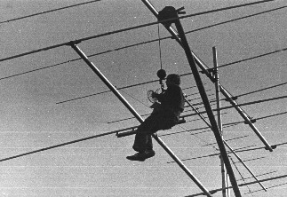 W8KFL in 1977 in Worthington, Ohio. Above: operating CQ World-Wide DX Contest, Below: dangling from a crane at 110 feet, fixing 5 element 20 meter yagi |